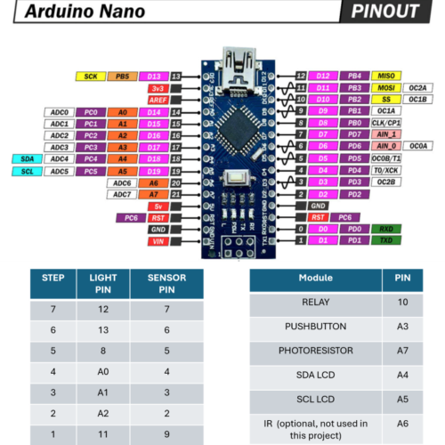 This project was made for 7 stairs so you have to adjust if you have more stair by using more Arduino nano or get an Arduino mega which has more pinouts