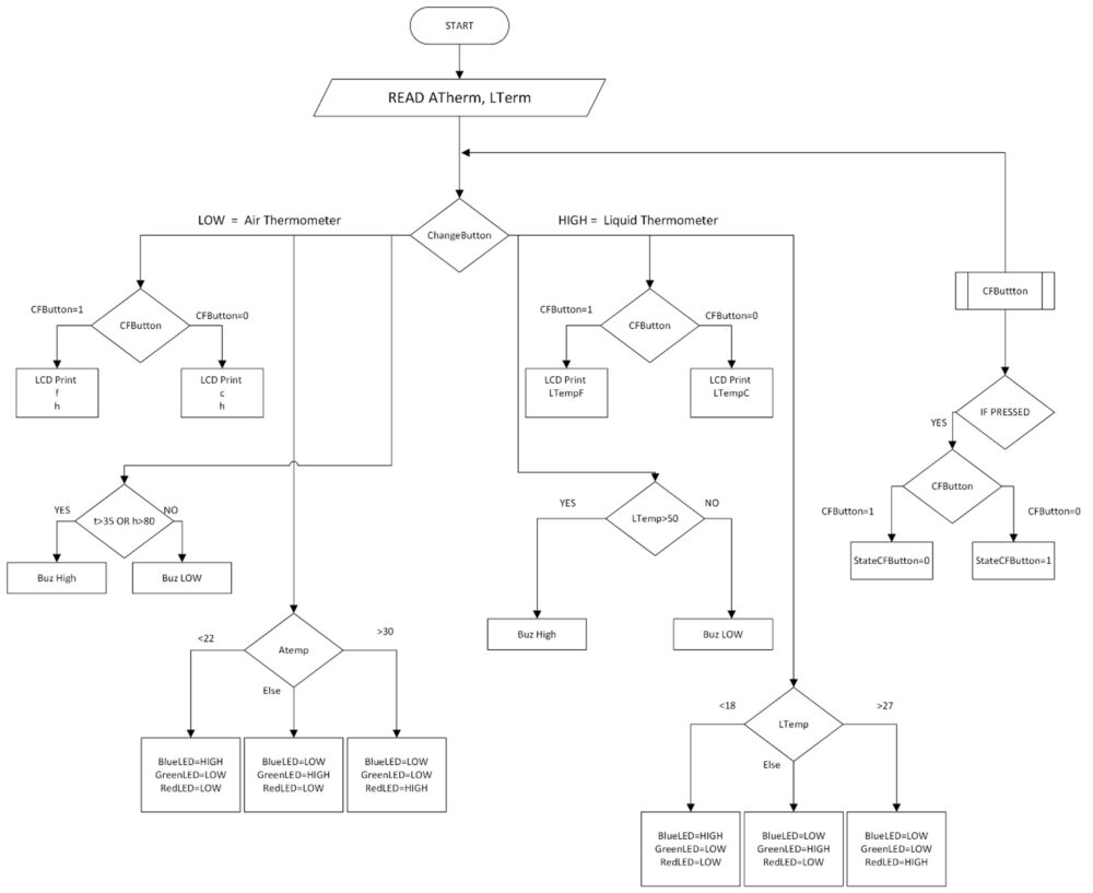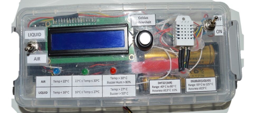 - For example, you can use different colored LEDs (blue for cold, green for optimal, and red for hot) to indicate the liquid’s temperature range.